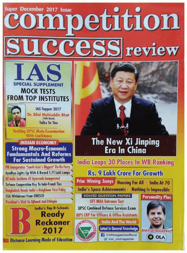 Competition Success Review, or CSR for short, is India’s premier general knowledge magazine. Our magazine is hugely popular across India, particularly with students who wish to appear for competitive entrance exams (Civil Service, MBA and others). Its content includes general knowledge trivia with a focus on Indian current events, Interview with IAS toppers, Interview and GD tips and sample question papers for different competitive examinations.